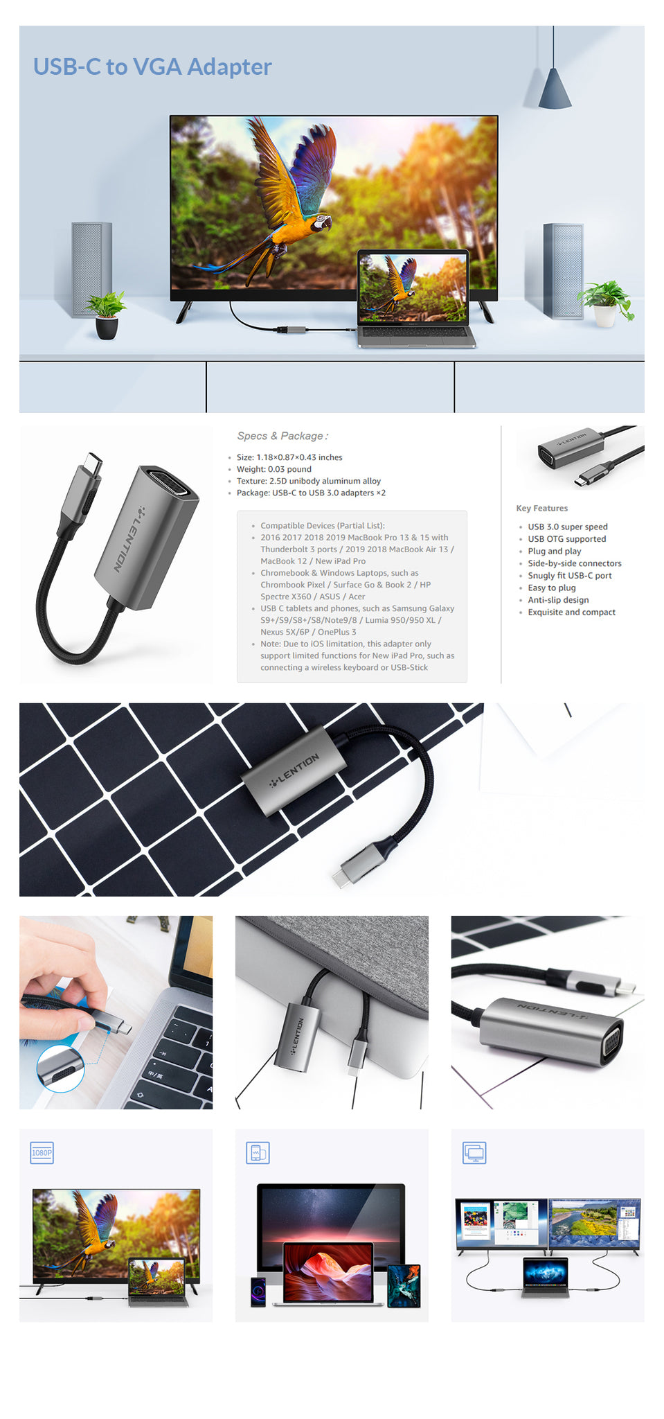 - USB C to VGA - Max resolution output is 1920x1080@60Hz (Full High Definition), downward compatible with 1080i, 720p, 576p, 480i / 480p.