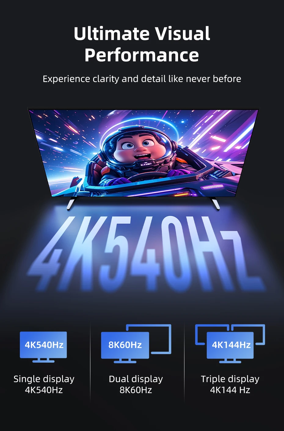 استمتع بعرض محتواك بتفاصيل مذهلة مع دعم 8K@60Hz و 4K@540Hz والمزيد، لتوسيع مساحة العمل أو الاستمتاع بمشاهدة فيديوهات فائقة الوضوح على أكثر من شاشة في نفس الوقت.